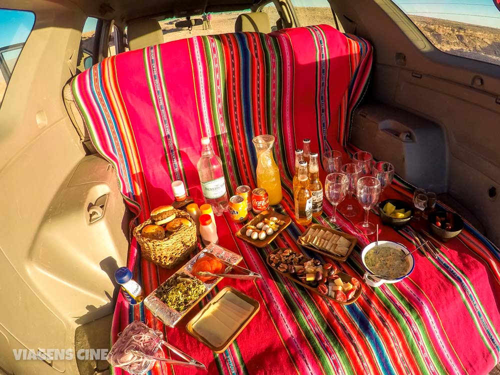 O sol já estava se pondo e acontece aquela surpresa sempre deliciosa nos passeios da FlaviaBia Expediciones. Carla tinha montado uma mesa deliciosa na parte detrás do carro, com sanduíches, petiscos, frutas e doces. E tinha até cerveja. Tudo free (incluso no valor do tour). Depois de toda aquela subida, tomar uma cerveja foi providencial.