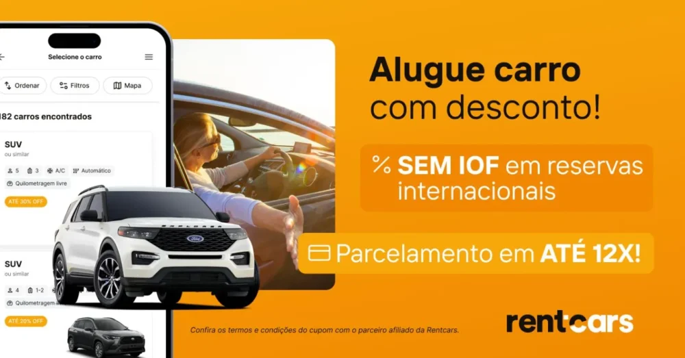 Aproveite o cupom de desconto VIAGENSCINE para 5% de desconto, para pagamento online pela Rentcars.